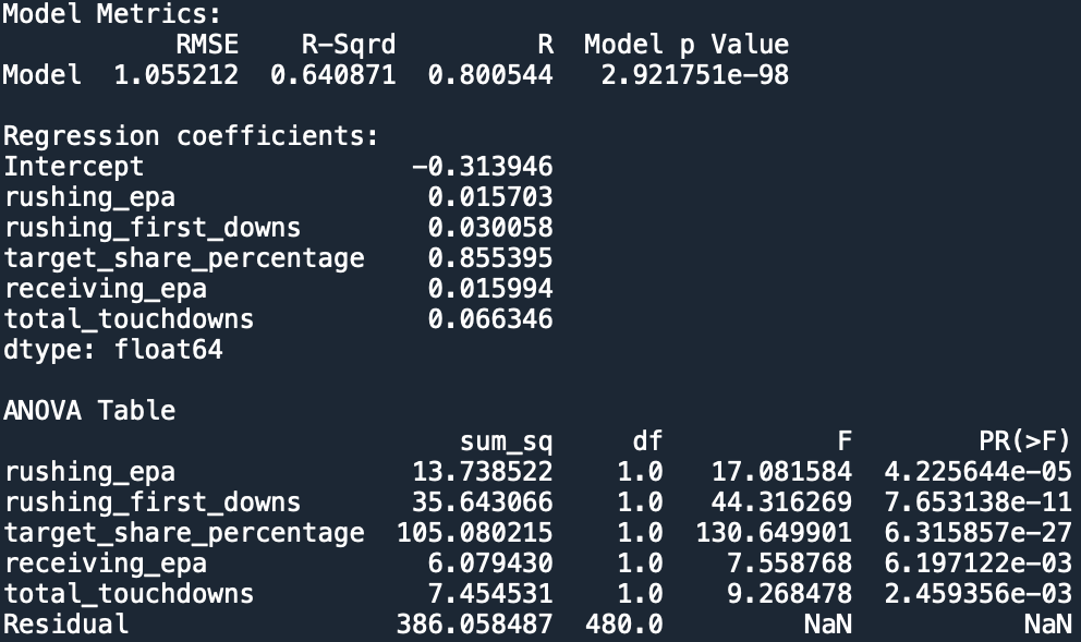 The model was significant and able to predict new contract CapAPY. The model metrics can be seen below. The R2 value of 0.64 illustrates that my model explained 64% of the variance and was overall statistically significant (p < 0.05). Regression coefficients (seen below) illustrate the slope of the line for each predictor variable when plotted against CapAPY (for example, a 1% increase in target share is associated with a 0.86% increase in CapAPY). While Rushing EPA and Total Touchdowns during the contract year were significant predictors, their regression coefficients paled in comparison to Target Share. Additionally, Receiving EPA was also a significant predictor and had an identical regression coefficient to Rushing EPA. These results demonstrate that RBs who have greater passing-game outputs are more valuable to teams than RBs who only contribute to the running-game. Interestingly, age was not found to be a significant predictor of CapAPY and when it was included, the evaluation metrics all decreased. It was hypothesized that age may have a quadratic relationship with CapAPY because NFL players’ rookie contracts (first contract in the league) are far below market value and their second contract is often their largest contract before subsequent contracts begin to decrease in value. However, after squaring age and adding that to the model, age was still not a significant predictor of CapAPY and decreased the efficacy of the model. Future work should look at how these trends change(d) over time.