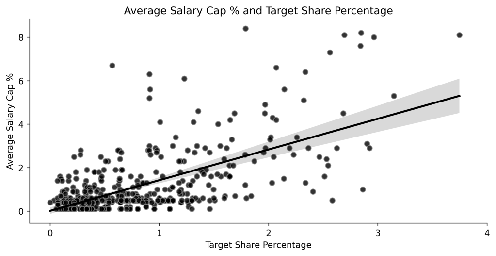 The purpose of this analysis was to develop a linear regression model to predict new RB contracts’ average salary cap percentage (CapAPY) based off their contract year (defined as the last season of their old contract) statistics. It was hypothesized that Rushing EPA and Total Touchdowns would be significant predictors of CapAPY. Prior to developing the model, I looked at some scatterplots to ensure there would be a relationship between the selected statistics and CapAPY. Ultimately, the selected inputs to the model were Rushing EPA, Rushing First Downs, Target Share %, Receiving EPA, and Total Touchdowns. The Target Share % figure is presented below.